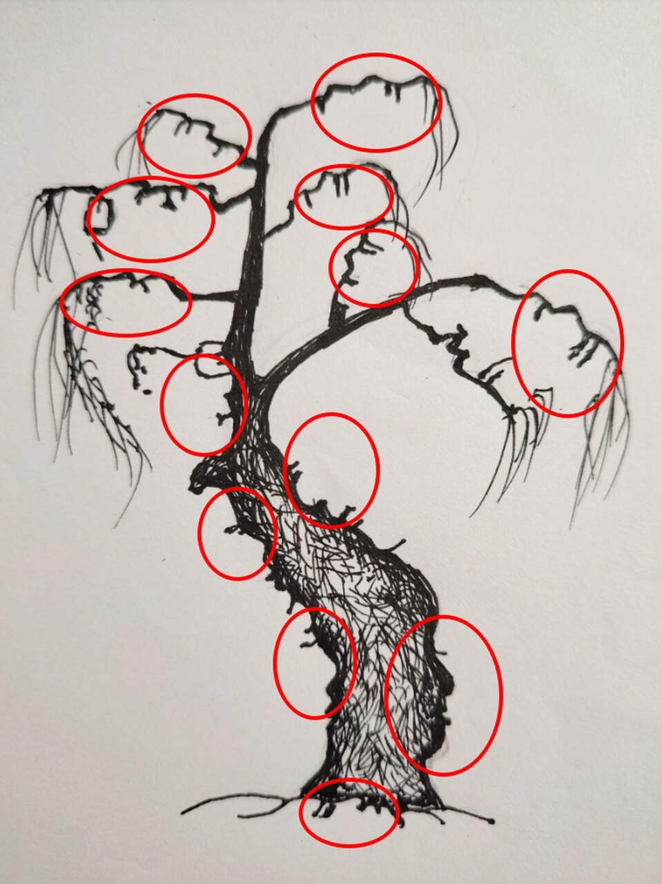 Hidden within the branches, leaves, and curves of the trunk are multiple human faces. Some are obvious once you notice them, while others are carefully blended into the shapes of the tree.