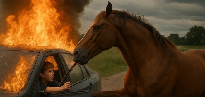 The fire roared, the glass crackled under the heat, and the smell of burning rubber hung in the air. The car, which had veered off the country road