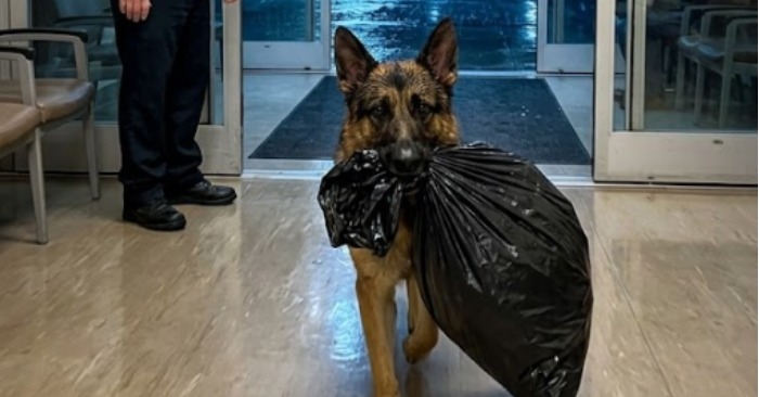 At first, no one could place where it was coming from. But seconds later, the doors burst open again—and a dog ran inside. A large German Shepherd, completely drenched, a heavy black bag strapped tightly across its back.
