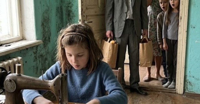The girl didn’t look up. Her fingers carefully guided a faded piece of blue fabric beneath the needle, her jaw clenched with a level of concentration far too heavy for someone so small.