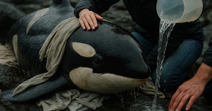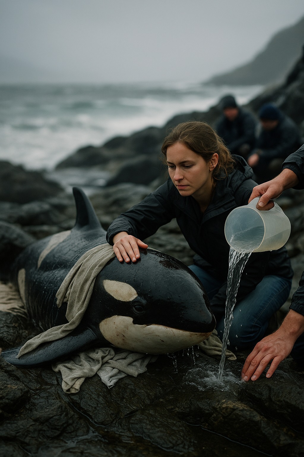 The tide had thrown it onto the sharp rocks, and now the water was receding. With every passing minute, the sun burned more intensely. The weight of her own body pressed on her lungs, and each breath was difficult. The orca made long, desperate sounds — cries of pain and calls for help.