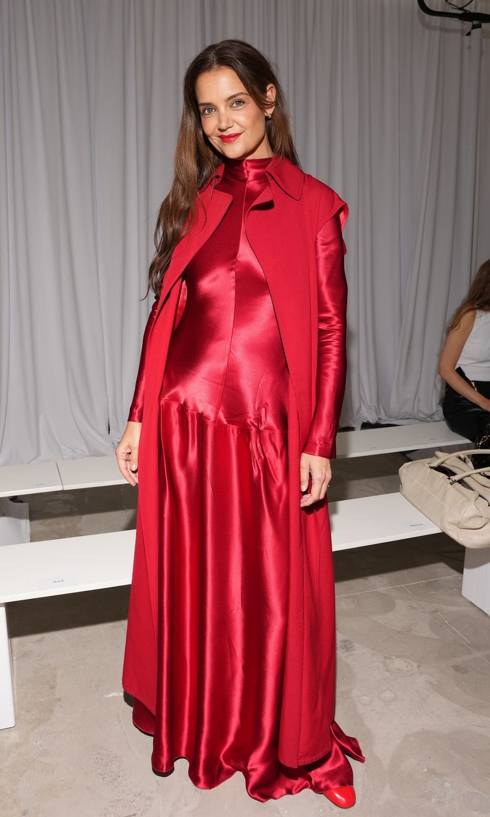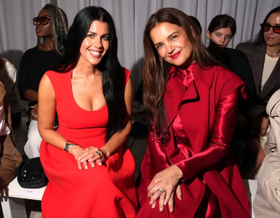 Seated front and center in the show’s first row, Holmes appeared alongside entrepreneur Gabriela Khalil — who, by coincidence or coordination, also arrived in shades of red. The pair drew plenty of attention as they posed together, perfectly aligned with the fashion house’s sophisticated aesthetic.