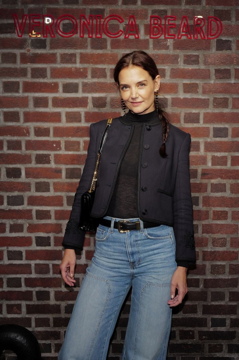 Just days earlier, Holmes showcased a completely different side of her style personality at Veronica Beard’s Icons Party. There, she opted for relaxed autumn vibes: light denim, a black turtleneck, and a navy jacket adorned with floral accents. A braided hairstyle and a structured black bag completed her effortless fall ensemble as she mingled with fellow guests, including her Poker Face co-star Natasha Lyonne.