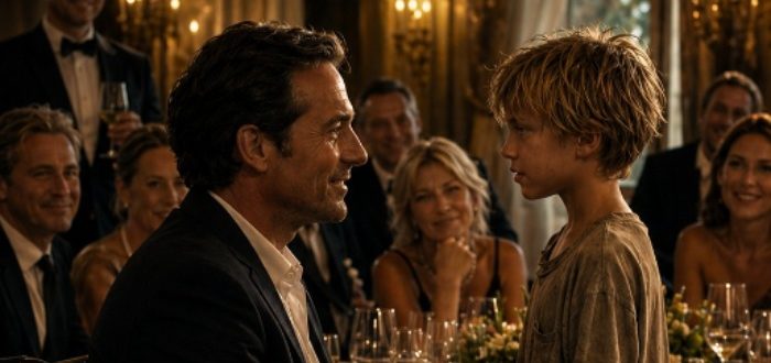 His clothes were worn and dusty, his shoes scuffed and barely holding together. His hair was uneven, his face marked by the kind of life that didn’t belong