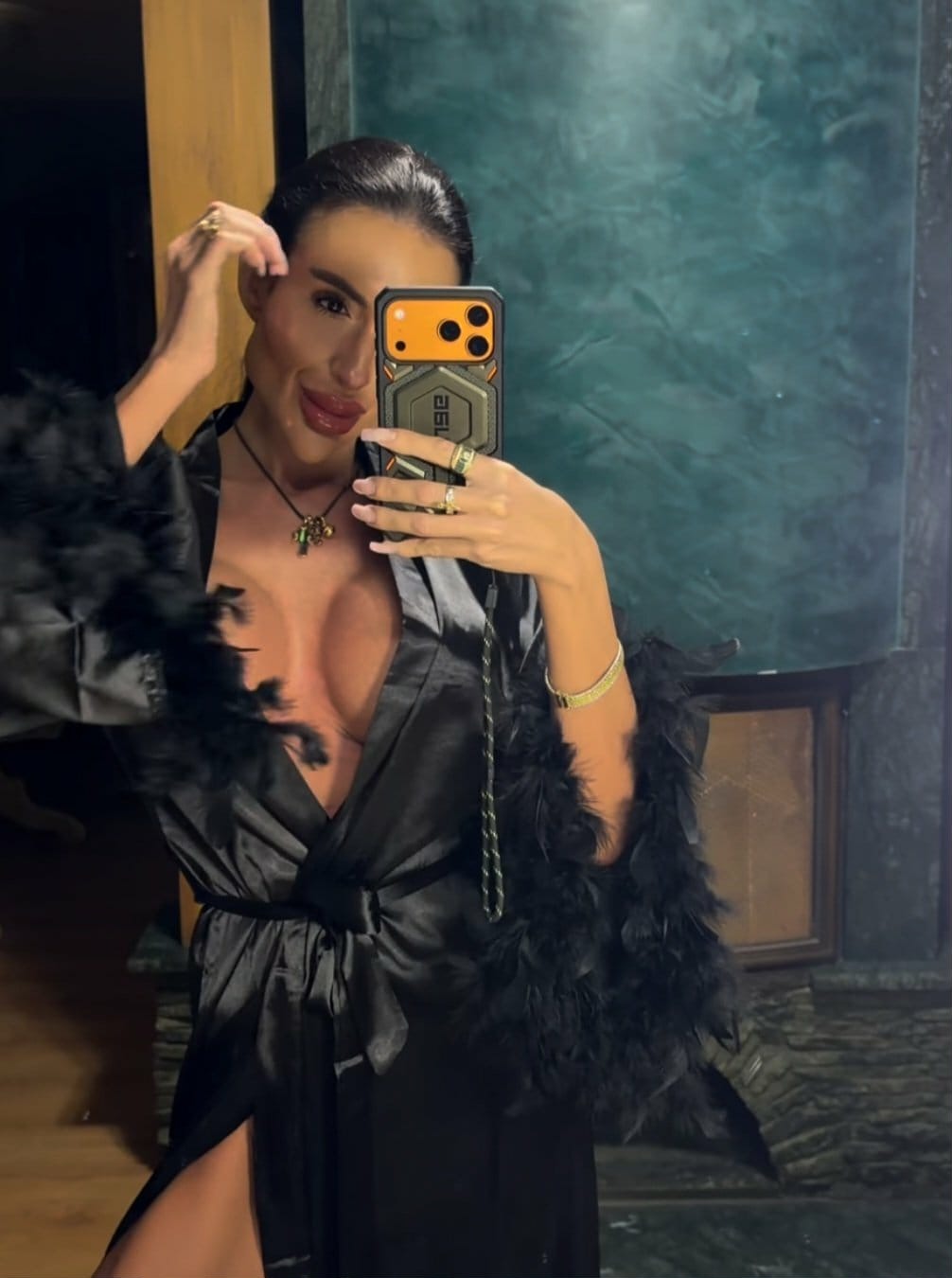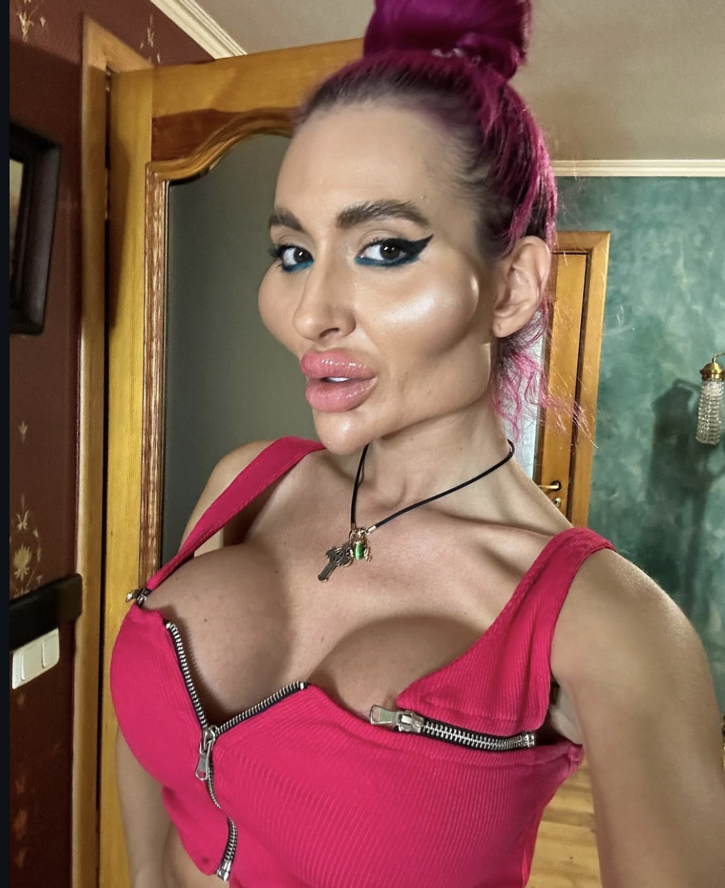 An influencer from Ukraine — widely known online for her dramatically sculpted cheekbones — has sparked a new wave of buzz after sharing fresh photos of herself posing in a silky robe, noticeably free of anything suggestive. But what really sent the comment section into chaos was one question repeated again and again: “Why do her implants look so far apart and as hard as stone?”