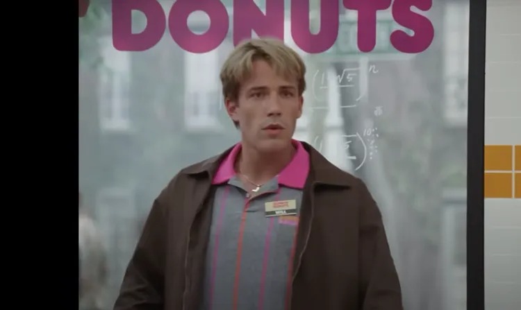 The one-minute commercial fully embraced nostalgic ’90s vibes. It kicked off with a grainy, VHS-inspired title screen teasing a “reimagined” version of Good Will Hunting as if it were a mid-’90s sitcom. A digitally rejuvenated Ben Affleck appeared behind the counter of a Dunkin’ location, sporting a name tag labeled “Will,” along with a gray striped polo featuring a bright pink collar and a deep brown jacket layered on top.