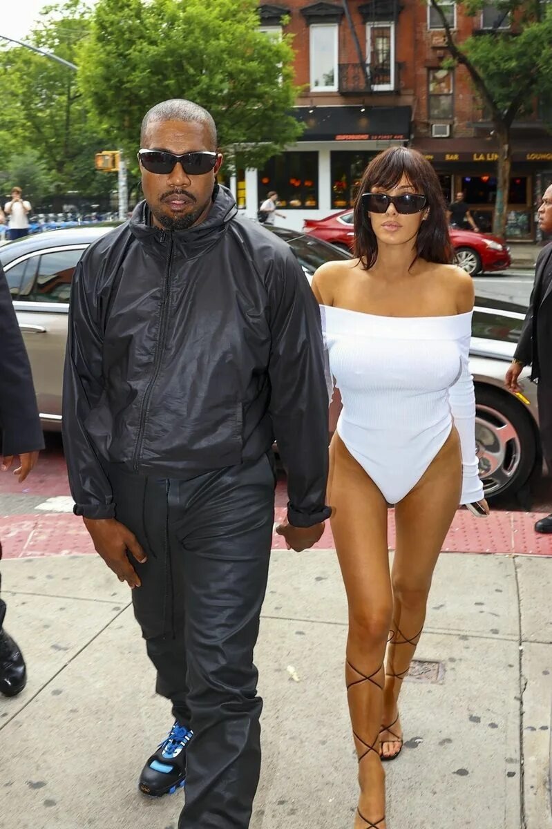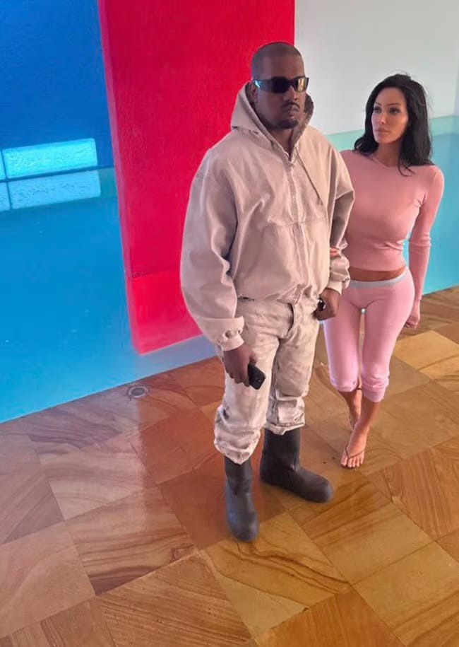 But it wasn’t the concerts making waves online. In viral photos taken ahead of the shows, Censori looked almost unrecognizable in a modest outfit: a white tee, straight-leg light-wash jeans, black slipper-style shoes, and her hair pulled into a slicked-back bun. Her makeup appeared natural, and she carried a puffer jacket while speaking on the phone. Kanye, by contrast, wore an all-black sweatsuit.