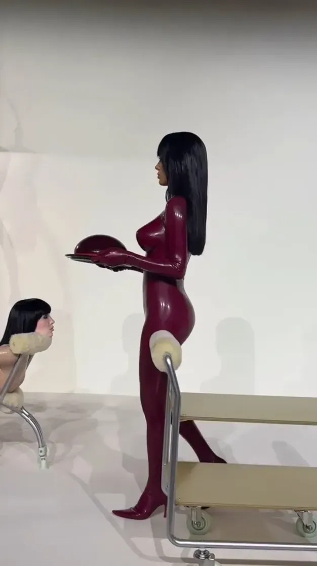 Dressed head-to-toe in a glossy red latex outfit paired with matching heels, Censori performed a carefully staged routine set inside a deliberately artificial environment. Onlookers watched as she mimed cooking in a fake kitchen before carrying the “dish” into a dining space unlike any other — furniture pieces were replaced by real people styled to resemble Bianca herself. According to reports, the concept behind both the performance and the unsettling human décor came directly from Censori’s own imagination.