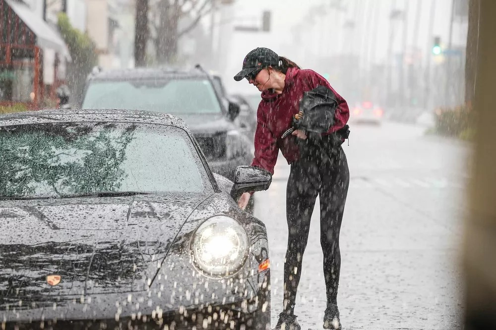Rain or shine, Dakota Johnson sticks to her routine. The 36-year-old star of Fifty Shades of Grey and Materialists was photographed in Los Angeles on February 16 after leaving a workout — and this time, the weather had other plans. As she exited the gym, heavy rain began pouring down, catching her mid-stride and giving paparazzi a dramatic shot.