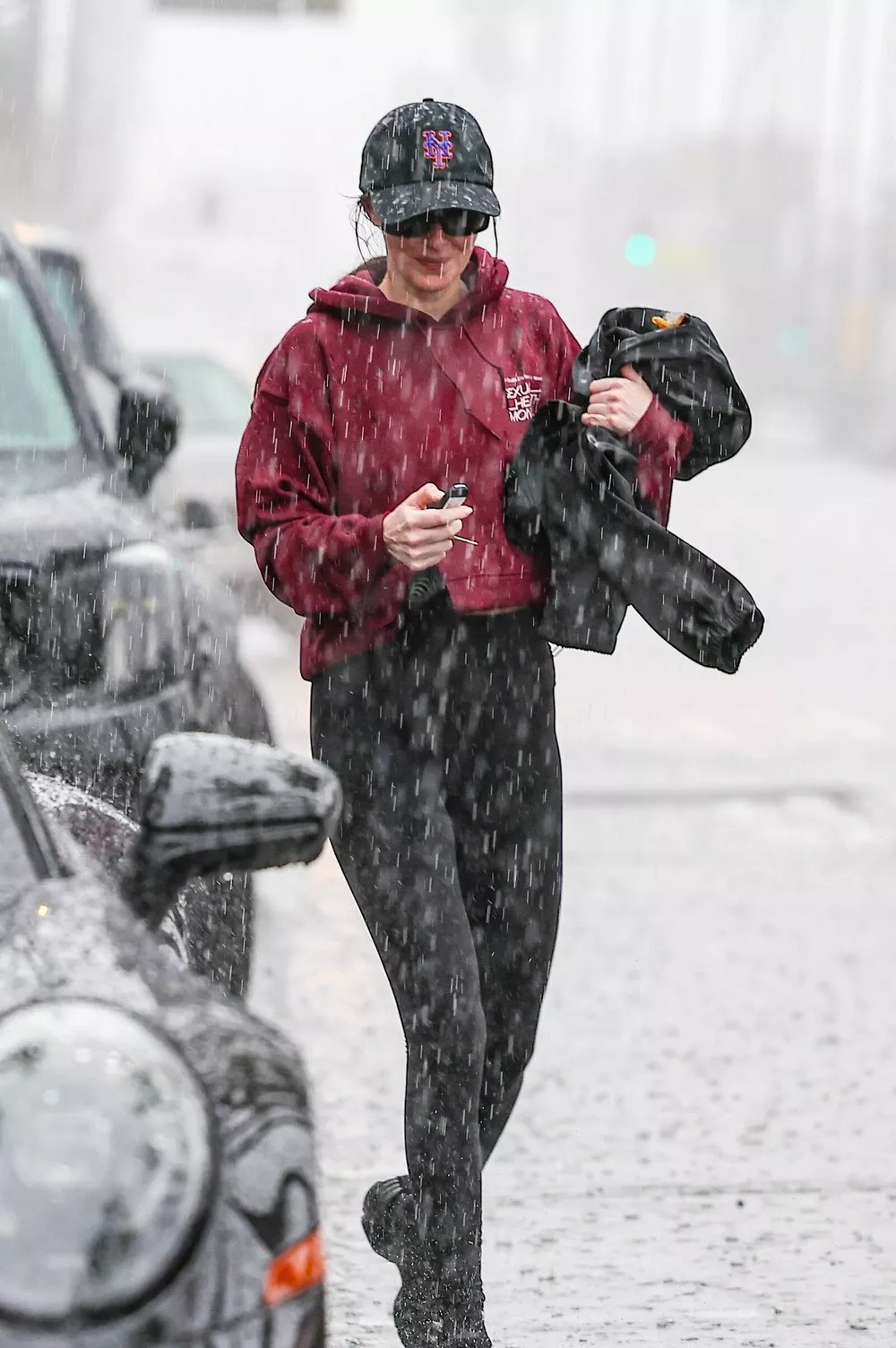 Johnson kept it sporty in a cropped burgundy hoodie, black leggings, and athletic sneakers. She topped off the look with a black baseball cap featuring a colorful “NY” logo. Despite the downpour, she was still wearing her sunglasses — and her windbreaker remained folded in her hand rather than over her shoulders, suggesting the storm caught her off guard.