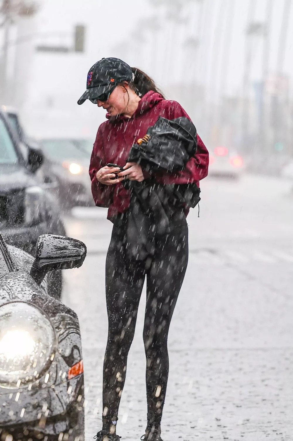 Rain or shine, Dakota Johnson sticks to her routine. The 36-year-old star of Fifty Shades of Grey and Materialists was photographed in Los Angeles on February 16 after leaving a workout — and this time, the weather had other plans. As she exited the gym, heavy rain began pouring down, catching her mid-stride and giving paparazzi a dramatic shot.