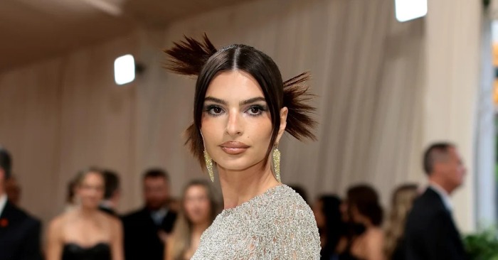 She elevated the monochrome set with a full glam beauty moment. Her dark brown hair was worn sleek with a center part, framing her face alongside oversized silver hoop earrings. Her makeup leaned sultry: molten copper and brown smoky eyeshadow, sharp black winged liner, and her signature mauve-gloss lip.