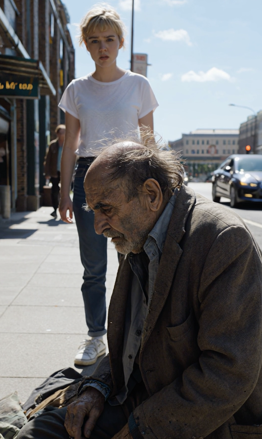 For weeks, the old man sat quietly on the same corner of the busy street. His coat was torn, his shoes barely held together, and his face was lined with years of hardship. Most people walked past him without a second glance. Some avoided eye contact altogether, others muttered about how he was “probably just another beggar.”