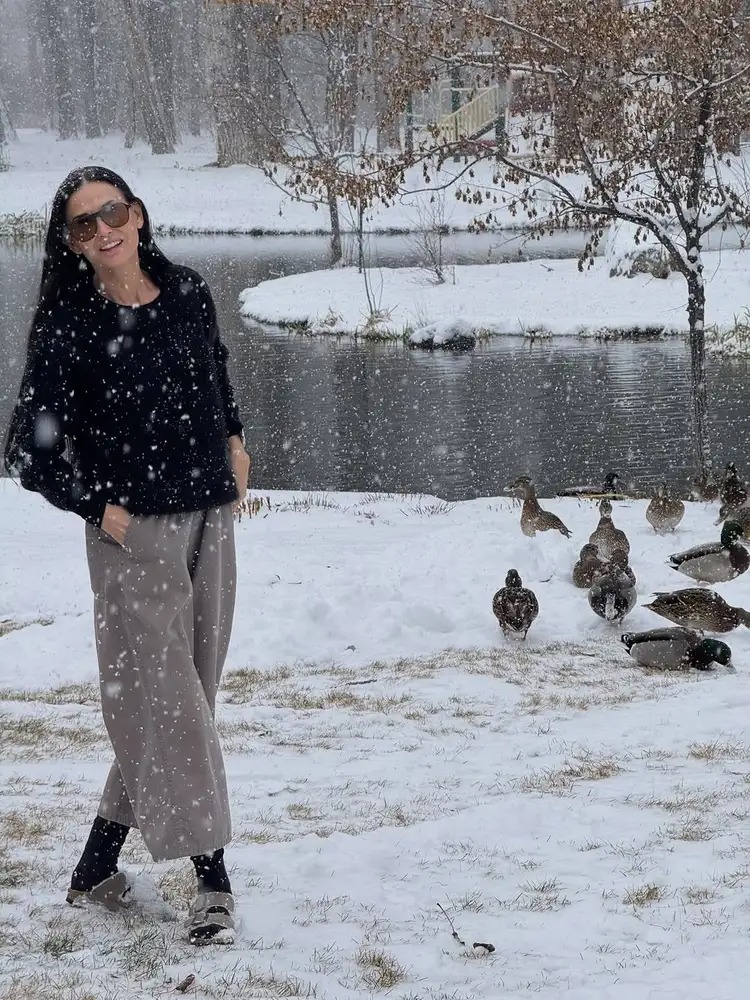 Moore also offered another glimpse into her low-key holiday spirit with snowy outdoor photos taken near her home. Wrapped in a black sweater and gray jeans, she leaned into comfort with her signature socks-and-sandals combination—proof that even Hollywood icons have unapologetically cozy habits.