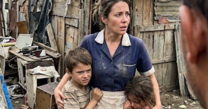 A frightened woman shielding her children.