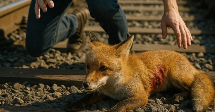At first, he thought — trash, a piece of fabric, maybe the wind. But when he looked closer, he realized: it was a tiny fox cub. A little reddish ball of fur, trembling, trying to get free — but its paw was stuck between the metal rail and the wooden tie. It wriggled, whimpered — and the sound made Alexey’s heart clench.