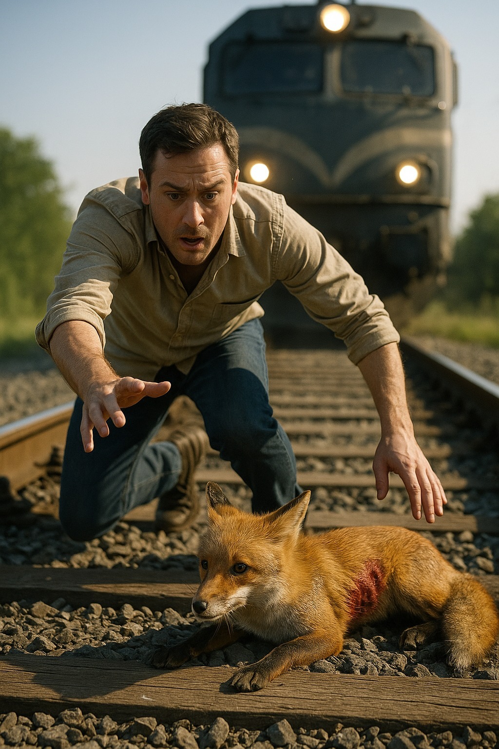 At that exact moment, the train roared past — screaming steel, wind, and force — knocking him off his feet. He fell into the grass, still clutching the little fox to his chest.