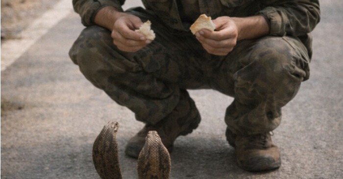 At first, the snakes recoiled. Then, slowly, they approached. The next day, he brought some meat. Curious, he wanted to see if they would get used to him. It became a small secret that broke the monotony of camp life.