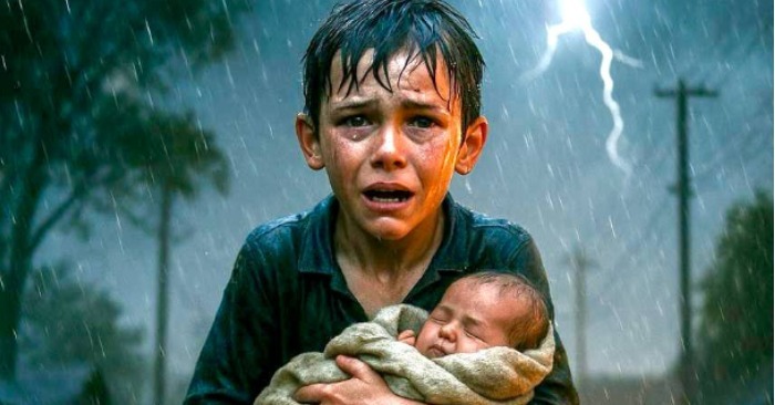 Rain pounded on the rooftops, and the wind tore at the branches as if it wanted to rip the village out by its roots. The night was so dark it felt like darkness itself had fallen to the earth. In the roar of thunder and the screech of the wind, a small boy named Timofey was running barefoot along a water-flooded road. He was only eight years old. His face was scarred from a fire, his eyes wide, full of fear and tears. But in his arms he held the most precious thing he had — a tiny bundle, a tiny life — his newborn baby sister.