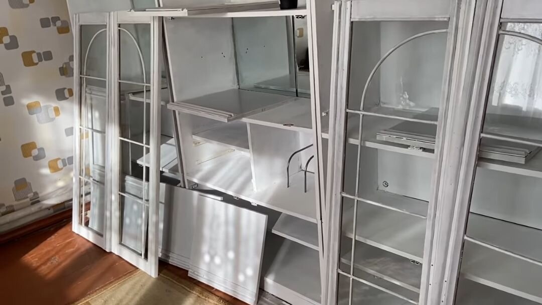 The exterior was coated with a linseed oil-based paint, giving the cabinet a subtle natural shine and improving its durability. For tricky corners and detailed areas, a brush was used, while larger, flat surfaces were covered with a roller to achieve an even, smooth look. Inside, the cabinet was refreshed with acrylic paint, instantly making it feel brighter and cleaner.