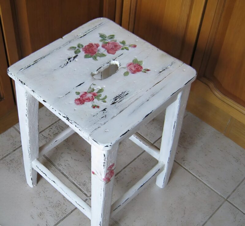 I used rose-themed decorative decals, carefully cutting and placing them on the backrest and legs. I blended the edges by hand so they would look like part of the wood itself.