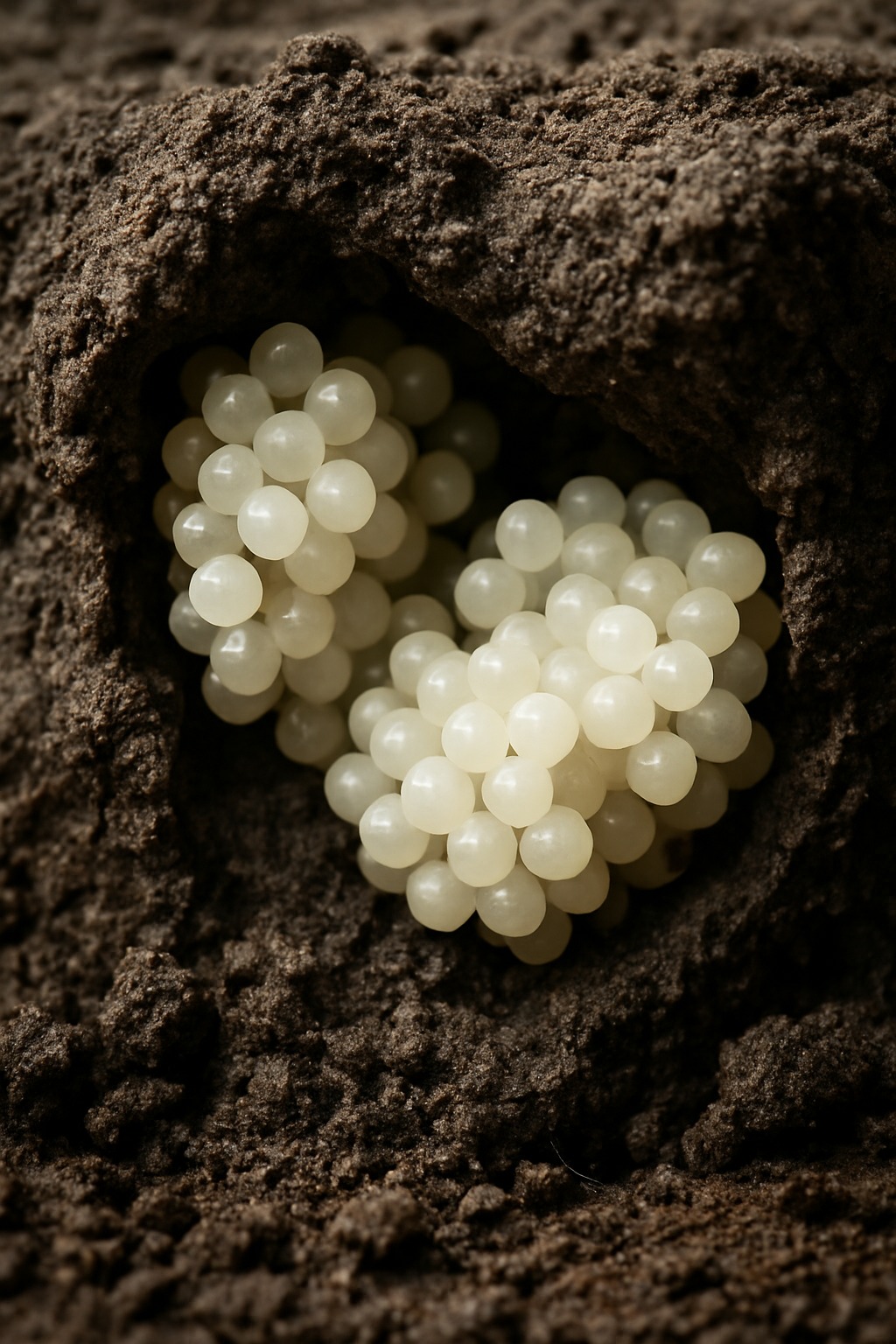 To make sure, she carefully removed the top layer of earth. And then she saw that the white spheres were arranged inside a compact chamber — as if something had deliberately constructed a nest around them. The soil had been packed tightly, forming a tiny cave — neat, almost as if made by hands… or by something just as skilled.