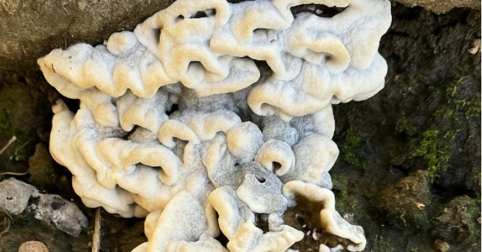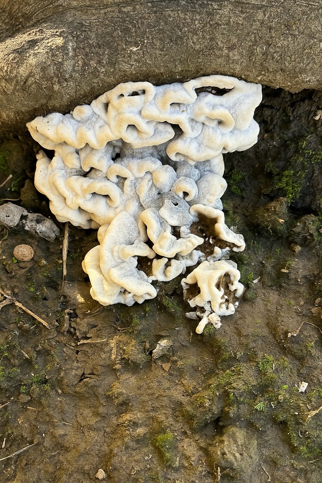 Its bright white colour, which in places turns into a soft cream shade, contrasts sharply with the dark brown bark and damp soil around it. The fungus seems to grow directly out of the wood, repeating the natural lines, depressions and protrusions of the root.