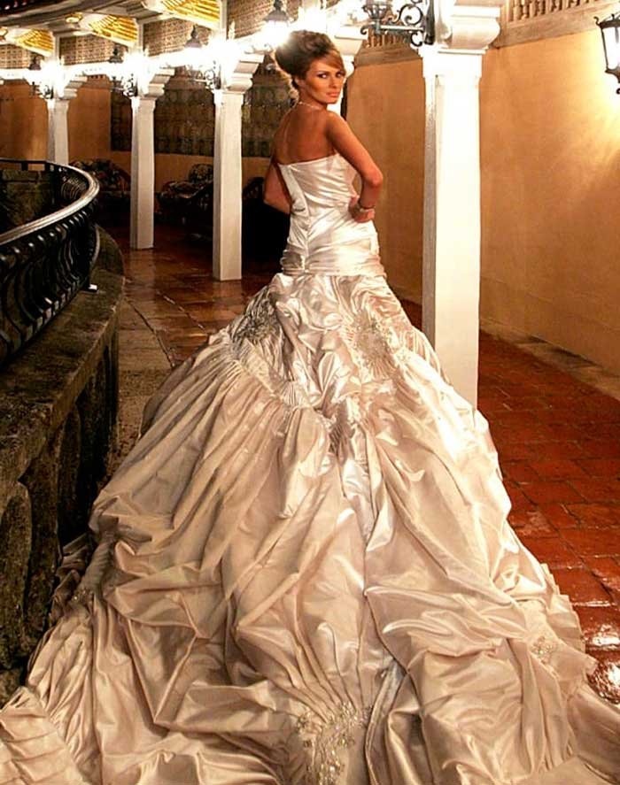 Designed by John Galliano for Dior, the dress embodied maximum glamour. Every detail pushed the limits of what bridal fashion could be. The train stretched nearly four meters behind her. The veil extended even further—around five meters. The fabric shimmered with crystals and pearls, while the entire gown weighed an astonishing 27 kilograms.