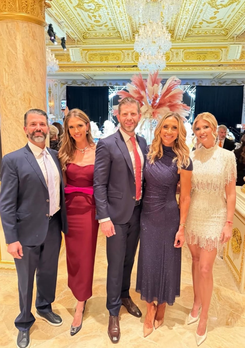 She arrived alongside her brothers, Eric Trump and Donald Trump Jr., both dressed in classic suits that kept the mood formal and cohesive. Eric was joined by Bettina Anderson, who wore a deep burgundy gown accented with a vivid pink waist detail. Donald Trump Jr. attended with Lara Trump, who opted for a dark, subtly shimmering evening look.