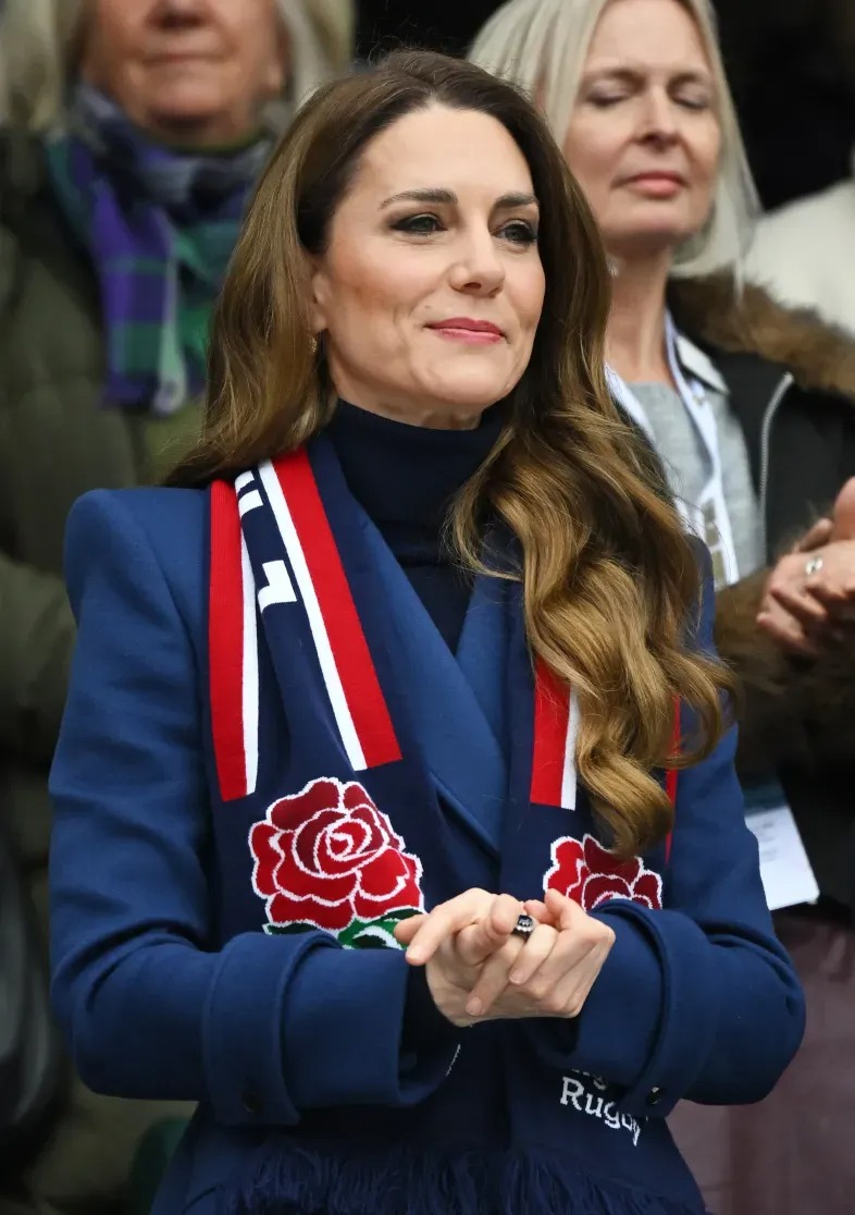 For the sporting event, Kate chose one of her trusted wardrobe staples — a tailored double-breasted blue coat by Alexander McQueen, a piece she has worn on multiple occasions. She paired it with leather gloves and a scarf adorned with large red roses, the emblem of England’s rugby team, subtly showing her support.