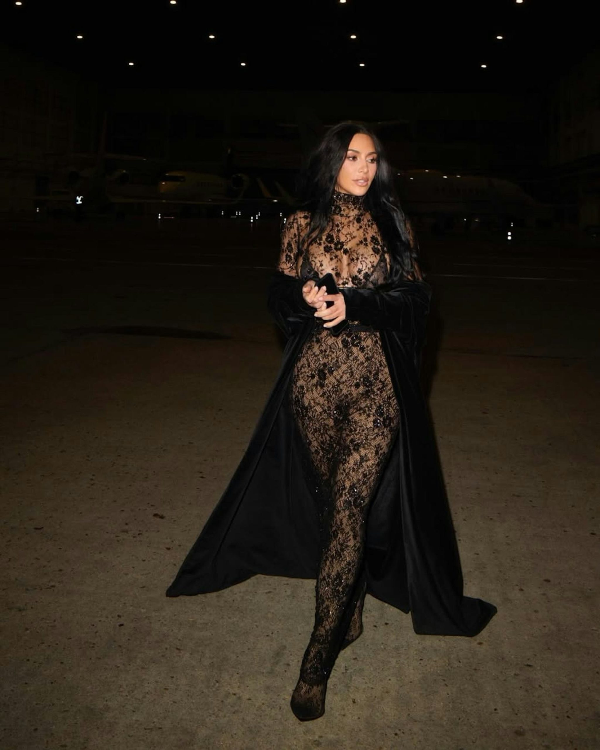 She reimagined the classic little black dress in signature Kim fashion, wearing a long-sleeved, floor-length gown crafted entirely from sheer floral lace layered over mesh. The turtleneck neckline kept the silhouette refined, while the fully transparent fabric delivered maximum drama.