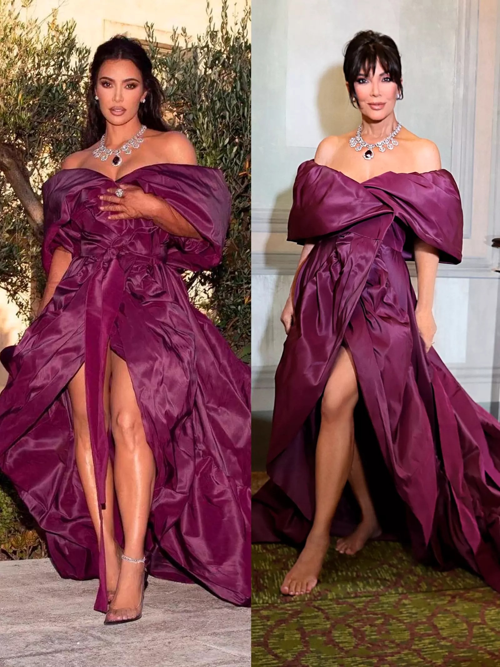Over the weekend, the Kardashian family matriarch made a dazzling appearance at Jeff Bezos and Lauren Sánchez’s wedding in Venice, wearing a gown that fashion lovers immediately recognized from Kim’s wardrobe. At 69, Kris stunned in a striking purple off-the-shoulder Dolce & Gabbana dress with a daring thigh-high slit, originally seen on the runway in Puglia two years ago. She even mirrored the key details: a bold drop-shaped amethyst necklace paired with sparkling diamond earrings. Adding her own twist, Kris skipped the shoes and embraced a barefoot, effortless style.