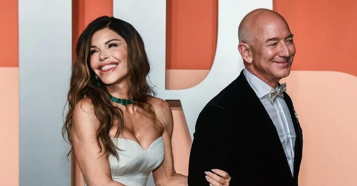 Bezos complemented her high-gloss moment with a look that was equally refined but understated. Jeff Bezos chose a tailored black suit with a faint metallic finish, accented by gold-trimmed buttons. He stuck to an all-black look, pairing a sleek button-down with matching boots, and let the details do the talking — dark shades, stacked beaded bracelets, and the subtle gleam of his gold wedding ring adding character to the outfit.