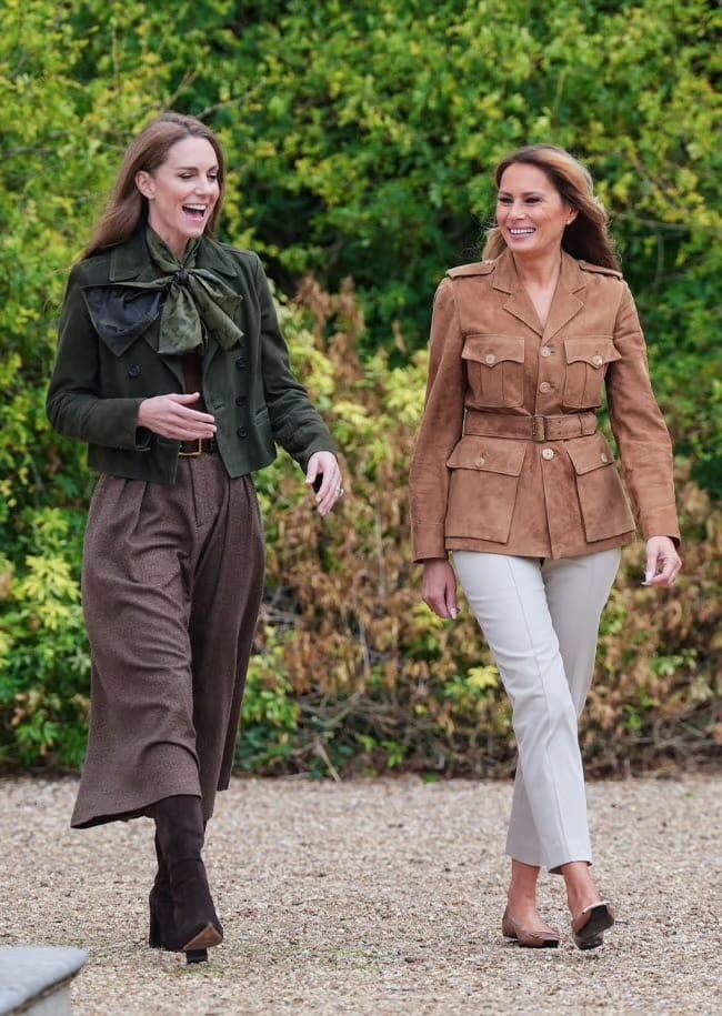 The appearance also reinforced a noticeable pattern in her recent public outings: jackets have become her signature power move. Just weeks earlier at Camp Lejeune, she stepped out in rich brown leather trousers paired with a safari-inspired jacket, striking a balance between strength and sophistication. And during a UK state visit in September, she opted for a caramel suede jacket styled with crisp white trousers while spending the day with Kate Middleton — once again choosing polish over spectacle.