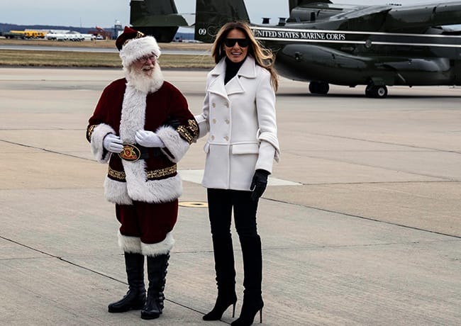 Her styling remained true to form: oversized sunglasses, hair worn loose, and an air of composure that drew as much attention as the clothes themselves. Arriving hand in hand with Santa Claus, Melania stepped into the spotlight to address the children and read a short Christmas story, blending warmth with restraint.