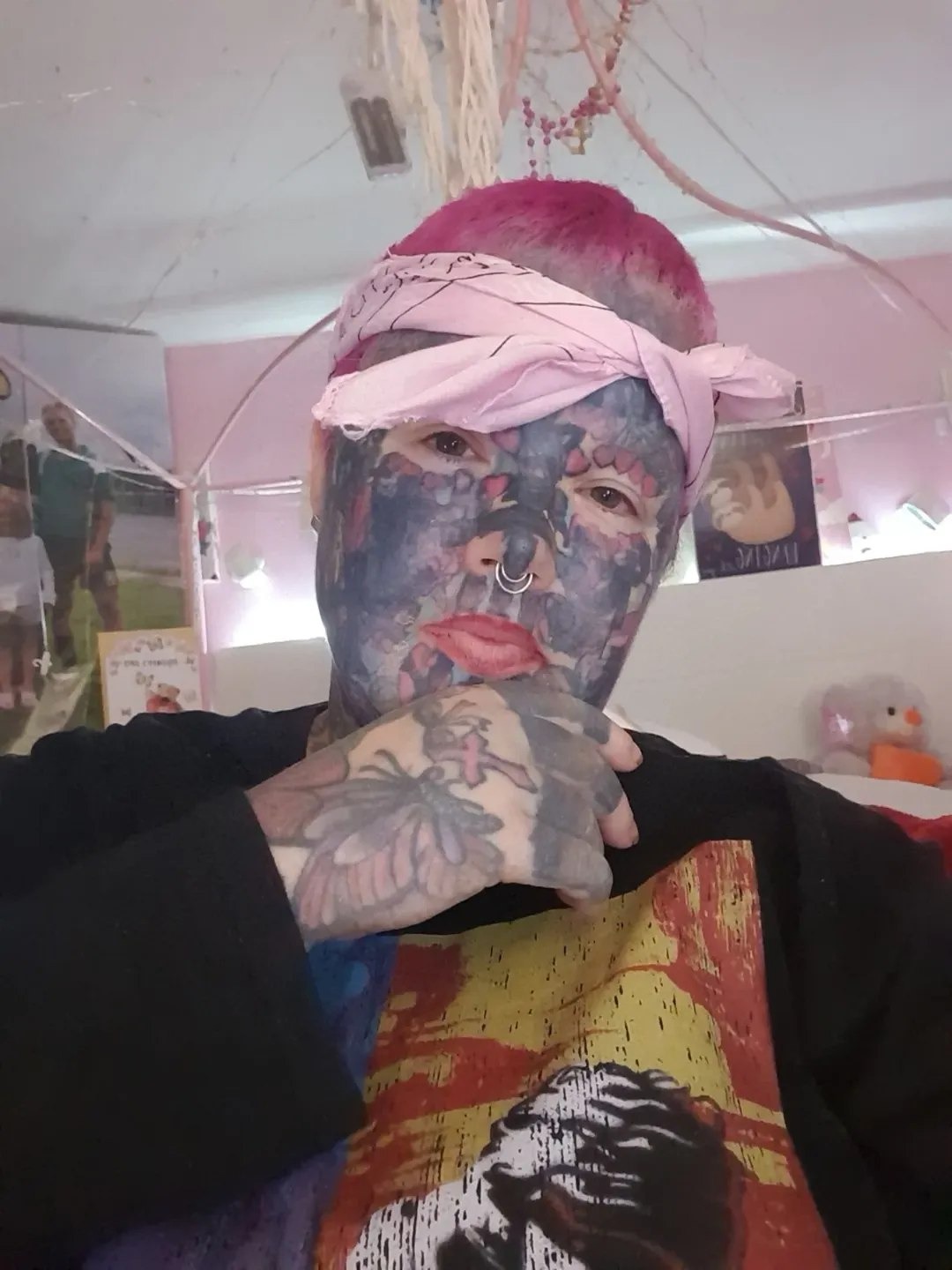 Once upon a time, Melissa looked completely different — a sweet woman with soft facial features, long blonde hair, and a kind smile. But over the years, her skin has become almost entirely covered in ink: her face, neck, arms, and even eyelids have turned into a living canvas. Today, tattoos are part of her identity — her “second skin.”