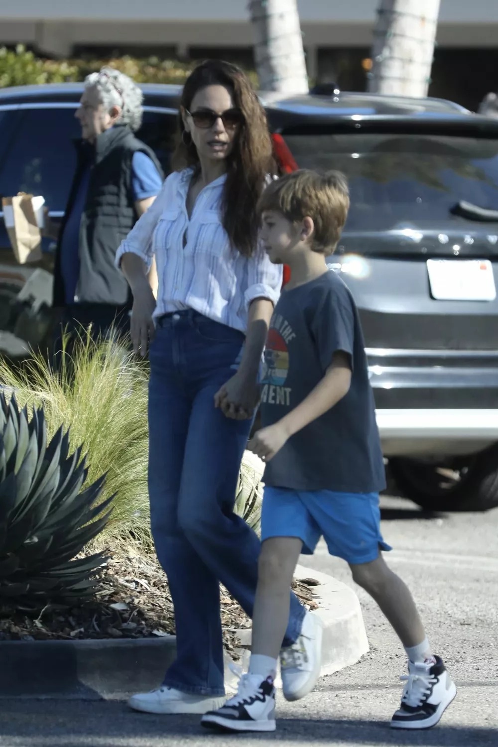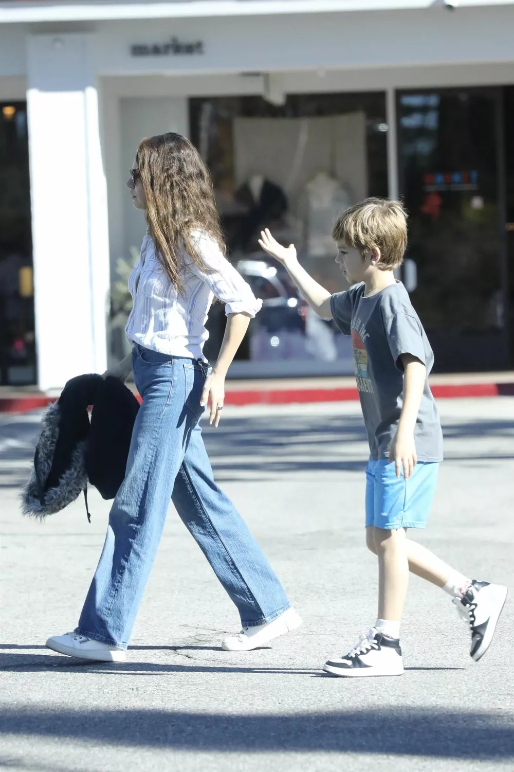 The 42-year-old actress kept things casual in a striped fitted shirt, straight-leg blue jeans, and white sneakers, carrying a black top with fur trim in her hands. Nine-year-old Dimitri Portwood opted for a gray graphic T-shirt, light blue shorts, and high black-and-white sneakers with long socks. The two appeared relaxed and animated, chatting and gesturing as they walked, seemingly unfazed by the cameras around them.