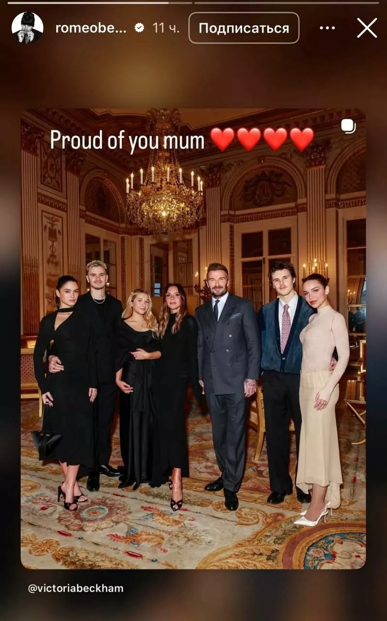 The Beckham clan traveled to Paris to support Victoria, who was honored by the French government with the title of Knight of the Order of Arts and Letters, a distinction awarded for significant contributions to culture, art, or literature. After the ceremony, Romeo shared his pride publicly, posting a message online that read, “Proud of you, mum,” accompanied by heart emojis.