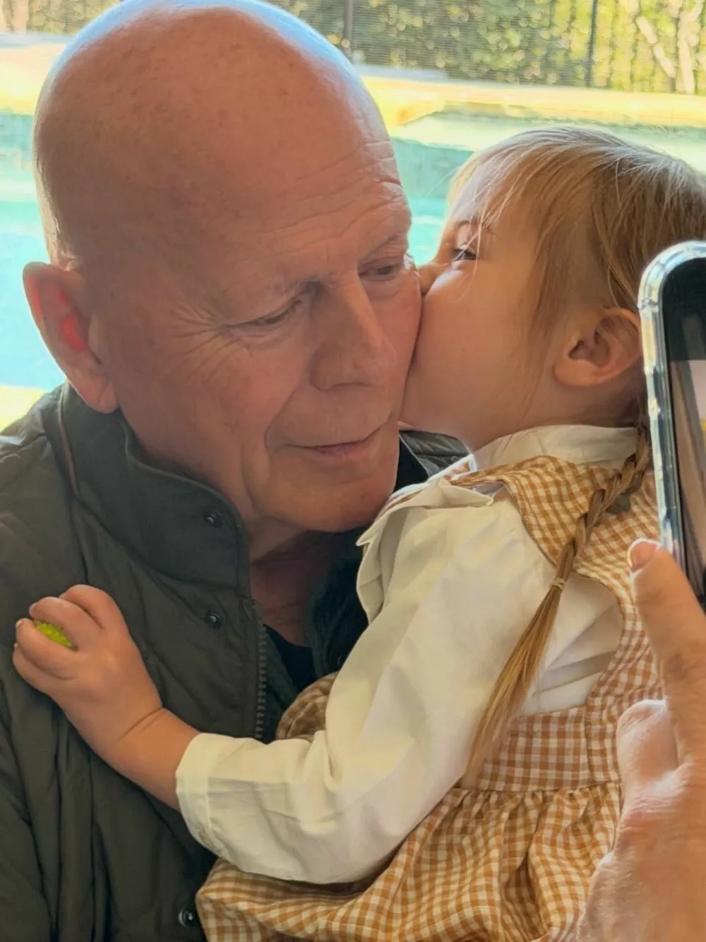 Demi Moore, his ex-wife, offered fans a rare and emotional glimpse into their private celebration. She posted tender photos showing Willis holding his two-year-old granddaughter, Louetta. In one touching moment, the little girl kisses his cheek; in another, she hugs him tightly as he smiles with quiet warmth.