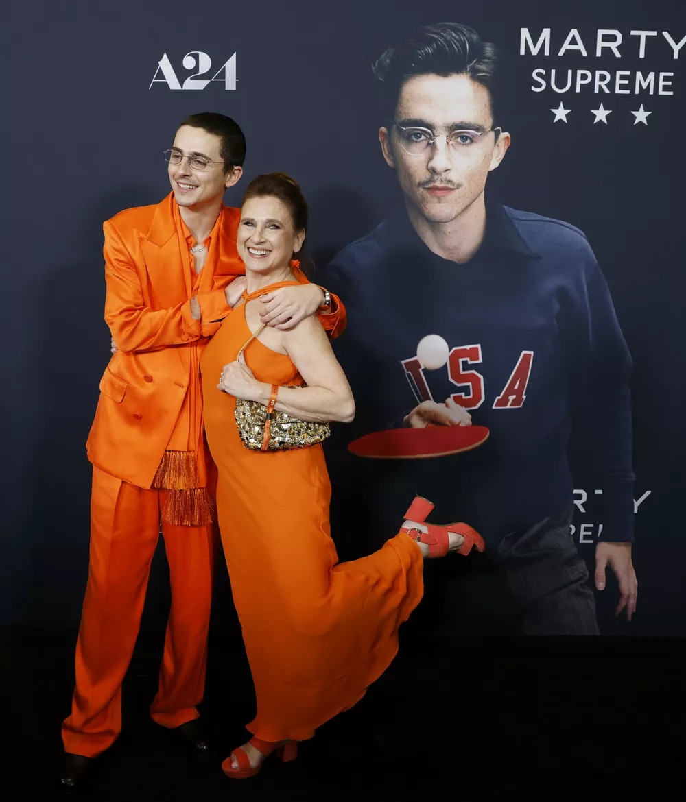 At 29, Chalamet stayed loyal to his now-signature color choice, stepping onto the carpet in a relaxed orange suit paired with a shirt, a fringed scarf, and black leather boots. His mother fully embraced the theme, appearing in a vibrant orange dress matched with platform sandals in the same shade and a shimmering gold baguette bag adorned with sequins. Together, they looked coordinated, confident, and effortlessly cool.