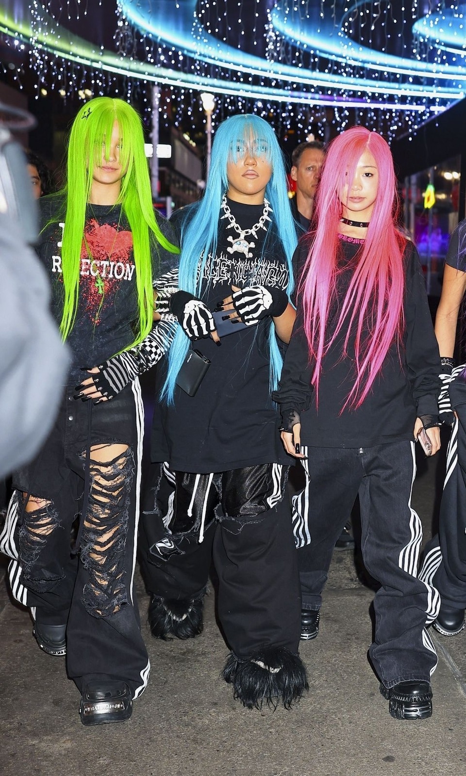 Her friends mirrored the vibe — black outfits topped with eye-catching neon wigs — forming a coordinated crew that was impossible to miss.
