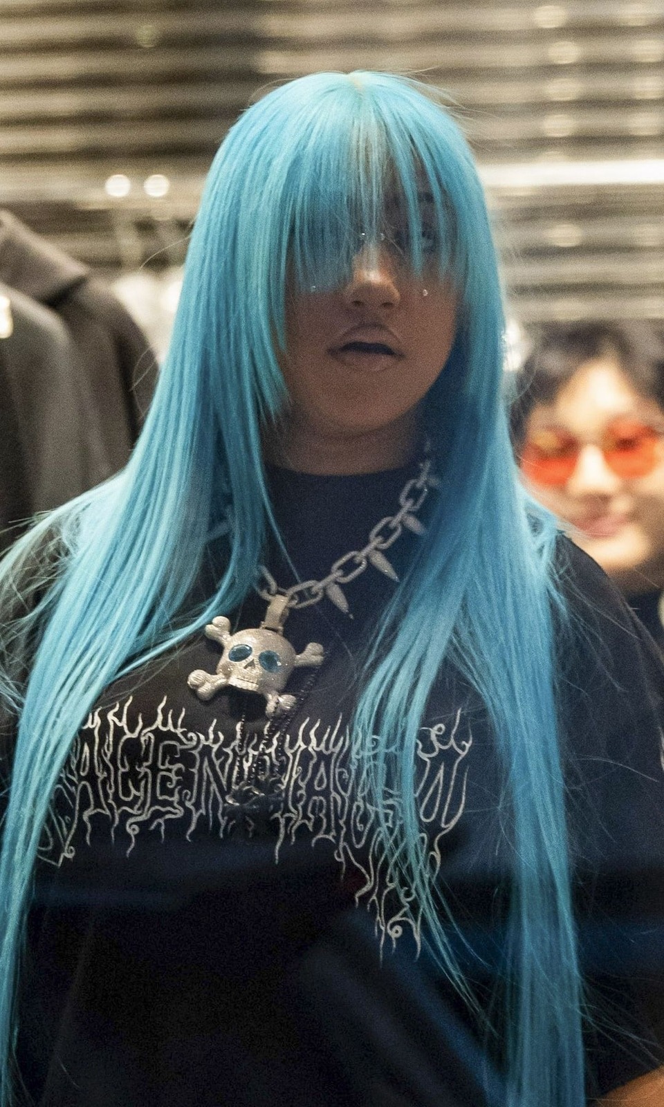 North chose a bright blue wig, pairing it with an all-black ensemble that leaned heavily into statement accessories. She wore a graphic tee, baggy pants, furry boots, skull gloves, and a chunky metal chain with a skull pendant. A spiked headband pulled the entire look together, giving it a dramatic, punk-inspired edge.