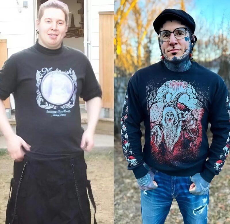 Now, there’s barely any space left on his body for new ink. His followers online are used to his striking appearance, but he recently stunned many by sharing an old photo from his youth — taken before he ever began his tattoo journey. The dramatic difference left people speechless.