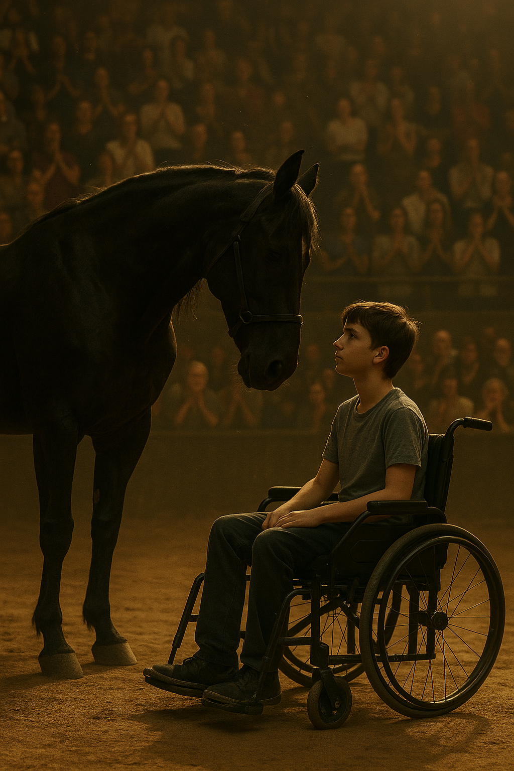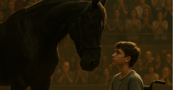 As the boy completed his circle and the stallion stopped loyally by his side, the arena erupted in thunderous applause. People rose to their feet, clapping, cheering, and shouting words of encouragement. It was no longer about competition or performance — it was about connection.