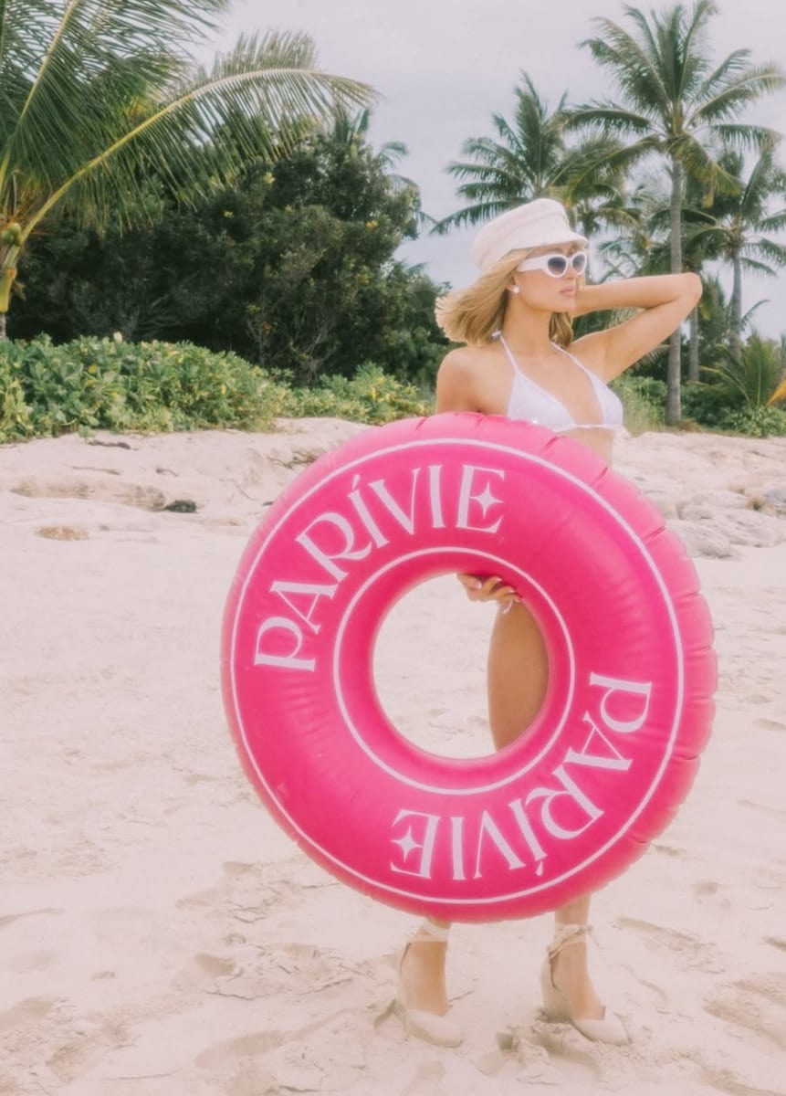 For a playful twist, Hilton posed with a large pink inflatable ring emblazoned with “Parivie,” turning the moment into both celebration and branding opportunity.