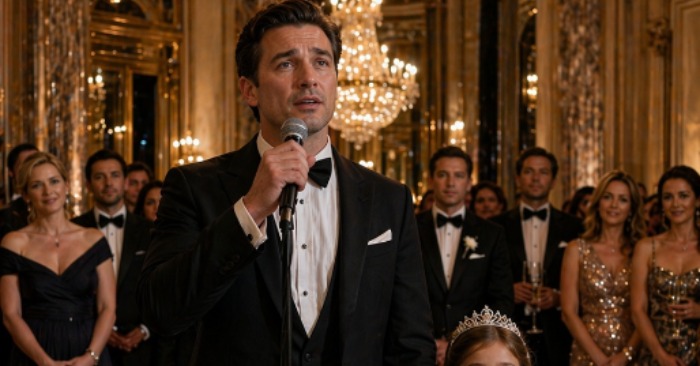 His clothes were worn and dusty, his shoes scuffed and barely holding together. His hair was uneven, his face marked by the kind of life that didn’t belong anywhere near chandeliers and silk dresses.