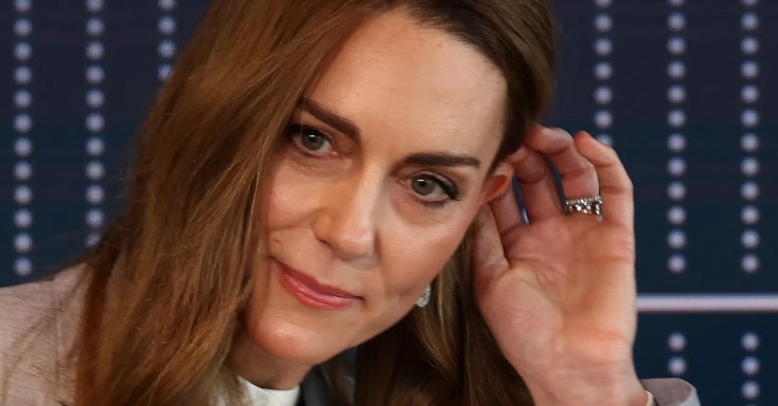 The Princess of Wales wore a flawlessly tailored light-gray suit, featuring a sleek, structured blazer and high-waisted trousers that flowed into a wide-leg silhouette. She anchored the ensemble with razor-sharp black heels, the pointed toes echoing the crisp lines of her suit.