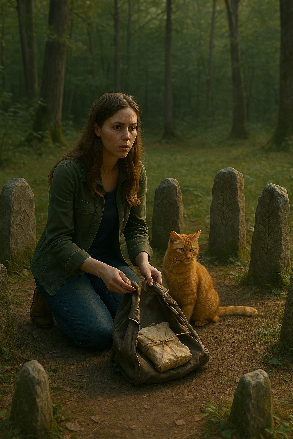There, laid out in a perfect circle, were stones. Each one carved with strange symbols, their grooves filled with moss. In the center lay a bundle wrapped in decayed cloth, darkened by age and damp.
