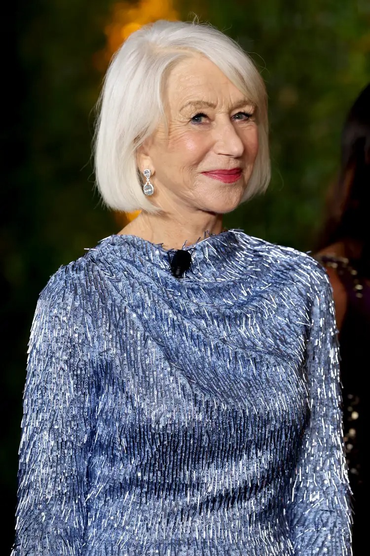 The event, held at the Academy Museum of Motion Pictures in Los Angeles, became Mirren’s personal snow globe. She arrived in a long-sleeved, fluid gown by Erdem, entirely coated in shimmering icy-blue sequins that cascaded like frozen droplets. The dress caught the light with every movement, creating the uncanny effect of icicles melting in slow motion. A coordinating clutch and diamond jewelry amplified the frostbitten fantasy.