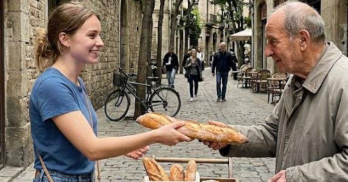 Every evening, around six-thirty, when the noise of Calle Mayor started to fade and she pulled down the heavy metal shutter, Clara followed a quiet ritual. Instead of throwing away the unsold bread and pastries, she carefully packed them into a warm paper bag. Then she crossed the street with steady steps, heading toward the worn stone steps of the church opposite the bakery. There, wrapped in a frayed blanket and accompanied only by an old backpack that seemed to hold his entire life, José was waiting.